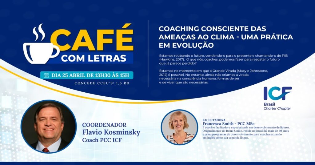 com Letras para associados da ICF . O tema será: Coaching consciente das ameaças ao clima- uma prática em evolução.
